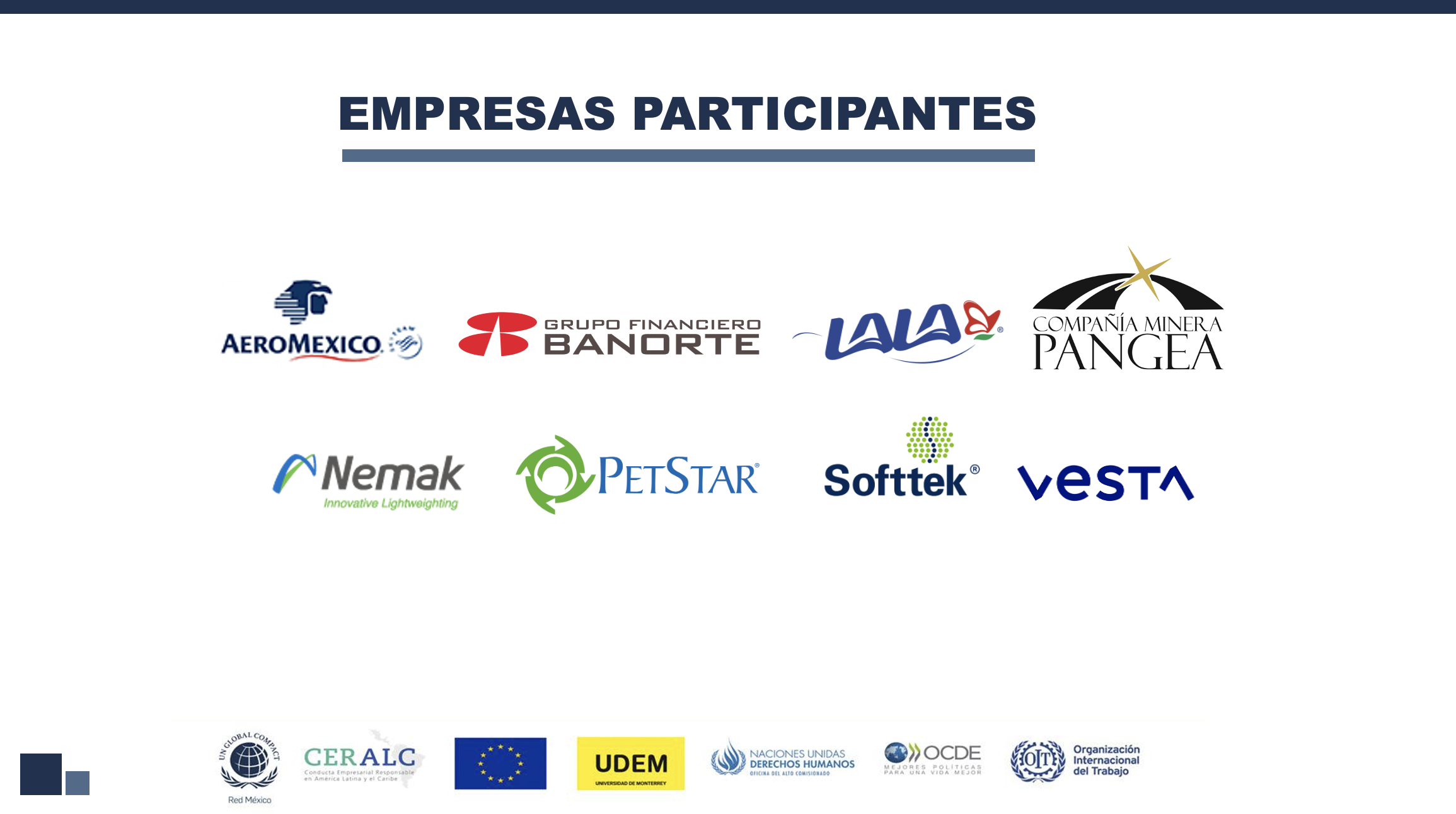 Las empresas participantes que han asumido este compromiso y que continuarán ahora en el diseño de un proceso de Debida Diligencia de Derechos Humanos son: Aeromexico, Grupo Financiero Banorte, Grupo Lala, Minera Pangea, NEMAK, Softtek, PetStar y Vesta.