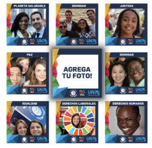 • Los trabajadores pueden tomarse una selfie de ellos mismos realizando una acción en relación a su ODS elegido, usando el marco de fotos de marca compartida UN75 / Global Compact-at-20, y usar la aplicación del marco digital para fotos aquí.