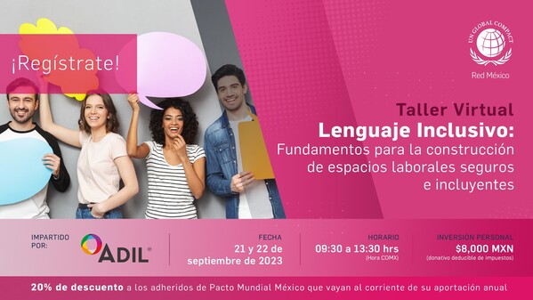Pacto Mundial México te invita al curso de entrenamiento “Taller Lenguaje Inclusivo” que contribuirá a que tu compañía incorpore el lenguaje inclusivo y buenas prácticas hacia la igualdad en la gestión del talento humano.
