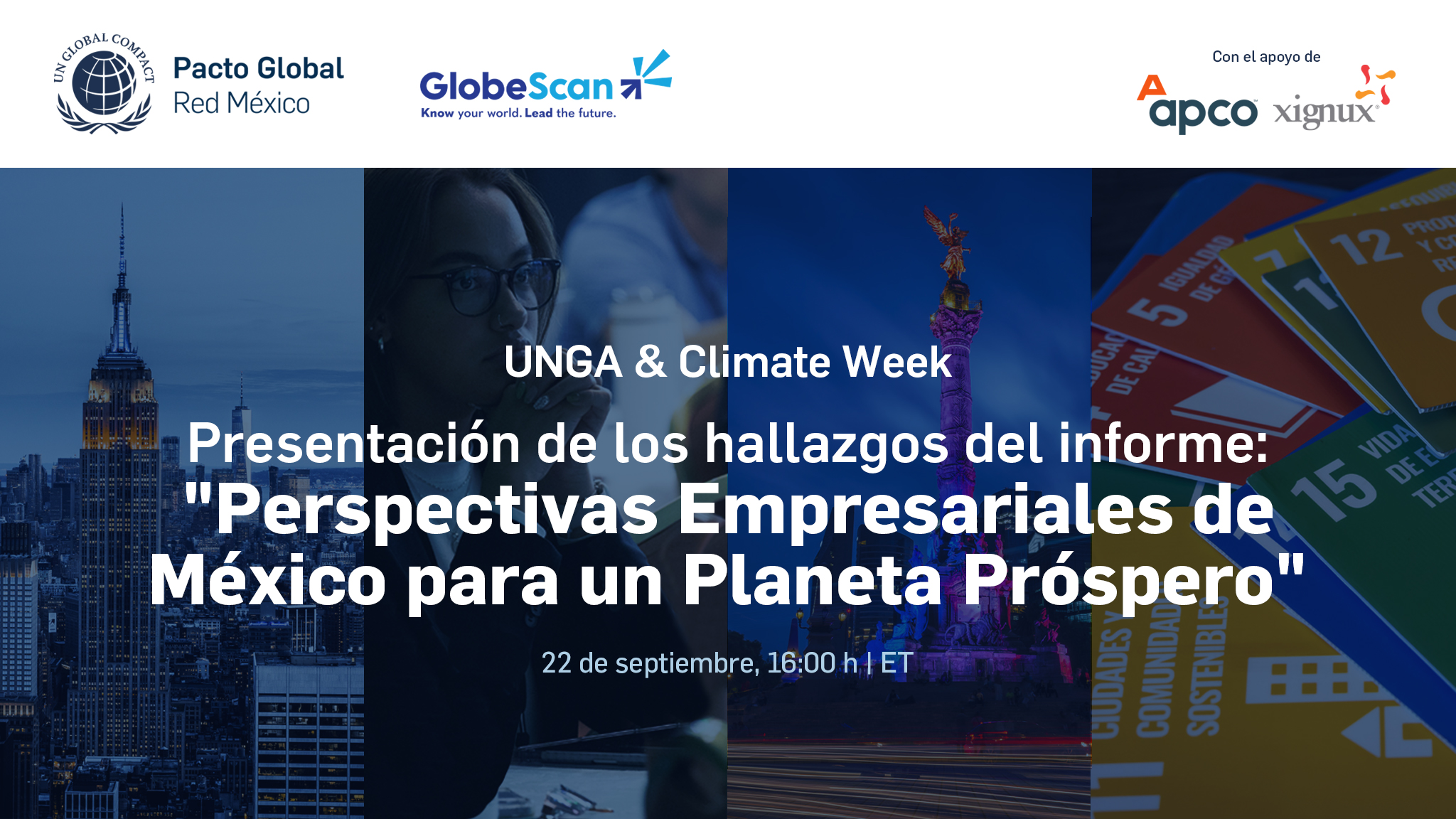 • Si te encuentras en NYC en la semana de la Asamblea General de las Naciones Unidas (AGNU) y la Semana del Clima de Nueva York, registrate para obtener una invitación al evento Business Insights for a Thriving Planet de Pacto Global México. * Invitaciones limitadas