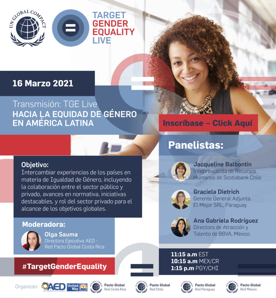 En el marco del evento global para visibilizar los avances y metas de Target Gender Equality, se llevará a cabo este panel regional, que busca exponer la situación de género en países de América Latina. Representantes de 3 empresas intercambiarán experiencias en materia de Igualdad de Género, incluyendo la colaboración entre el sector público y privado, avances en normativa, iniciativas destacables, y el rol del sector privado para el alcance de los objetivos globales.